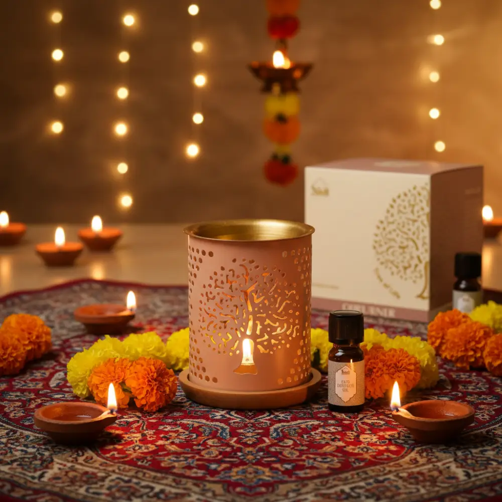 Rinkinį sudaro: stilingas metalinis garintuvas, varinė lėkštutė, medinis padėkliukas, žvakė (12 g) ir DOVANA – 10 ml agarmedžio aliejus.